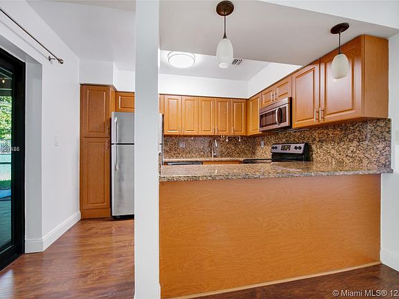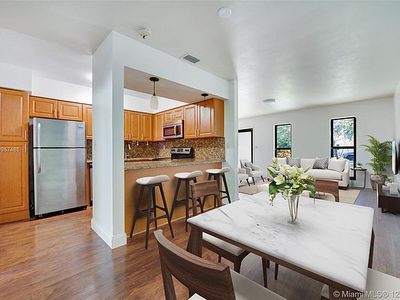 Live, Work, Learn, and Play in the Village of Pinecrest. This spacious Pinecrest duplex unit offers 2 bedrooms and 1 bathroom. The open kitchen features wood cabinets, stainless steel appliances, and granite countertops. Modern wood floors flow throughout the living and dining areas, and ceramic tile is located throughout the kitchen, bedrooms, and bathrooms. Feel sound and secure with impact windows and doors. Relax and dine inside the screened patio. Full-size washer/dryer/storage. 2 parking spaces. Pets welcome!