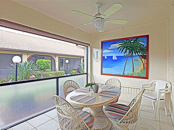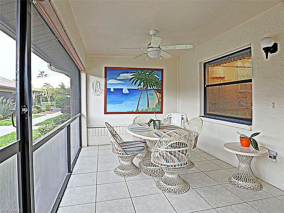 This Lovely Partially Furnished 2 bedroom 2 bath Villa is Highly Sought After! Boasting an open-concept kitchen/living room/dining area with a large pass-thru bar and a Split Bedroom floor plan which ads privacy. The Primary bedroom is loaded with light; with windows on two walls and a slider to the patio. It also has an En-Suite Bathroom with double sink and walk-in shower. The Guest bedroom and bath are spacious too! Both bedrooms have Walk in closets! Cathedral Ceilings add to the spacious feeling! There are TWO Large Screened in Lanais, one in the front and one in the back. Enjoy your garden view of the courtyard tiki where you will meet your neighbors and make new friends! The Community is completely fenced in for Privacy and Security. Low association fee includes the use of pools, tennis courts, gym, shuffleboard, scheduled community activities, 24-Hour Gated Security entrance, exterior maintenance, trash removal, pest control, insurance. Unit includes one assigned carport space and detached storage unit #53. Guest Parking Available. Close to Sanibel, Captiva, Fort Myers Beach, Shopping and Restaurants. One 30# pet allowed.