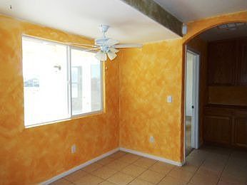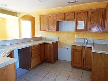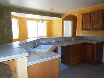 HUD Home. Beautiful house in a nice area of Apple Valley. Living room features a corner tile fireplace. Large master bedroom includes dual sinks with tile countertops and a large bathtub. Formal dining area with ceiling fan. Inside laundry room with storage for all your needs. Enjoy the views of your large backyard from the covered patio!
