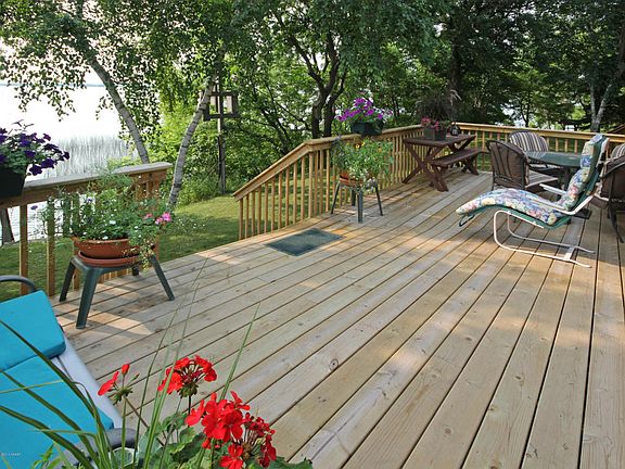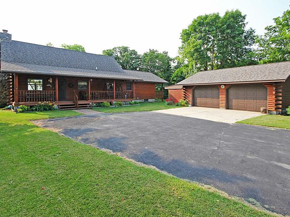 Oh, my...this one is nice!! Dreamed about a log home on a great fishing lake?! This is it!! Extremely nice home featuring large lakeside master bedroom/bath suite with access to covered porch. Large covered roadside porch, too, plus large new lakeside deck. All perfect for enjoyment outside! Good hard bottom shoreline with handy lakeside shed. Main level laundry adjacent to MBR & large butler's pantry! There is storage space galore in this year round home! Large detached garage with lean-to for storage & extra garden shed near fenced garden area & apple trees! This is a must see! Please view virtual tour!