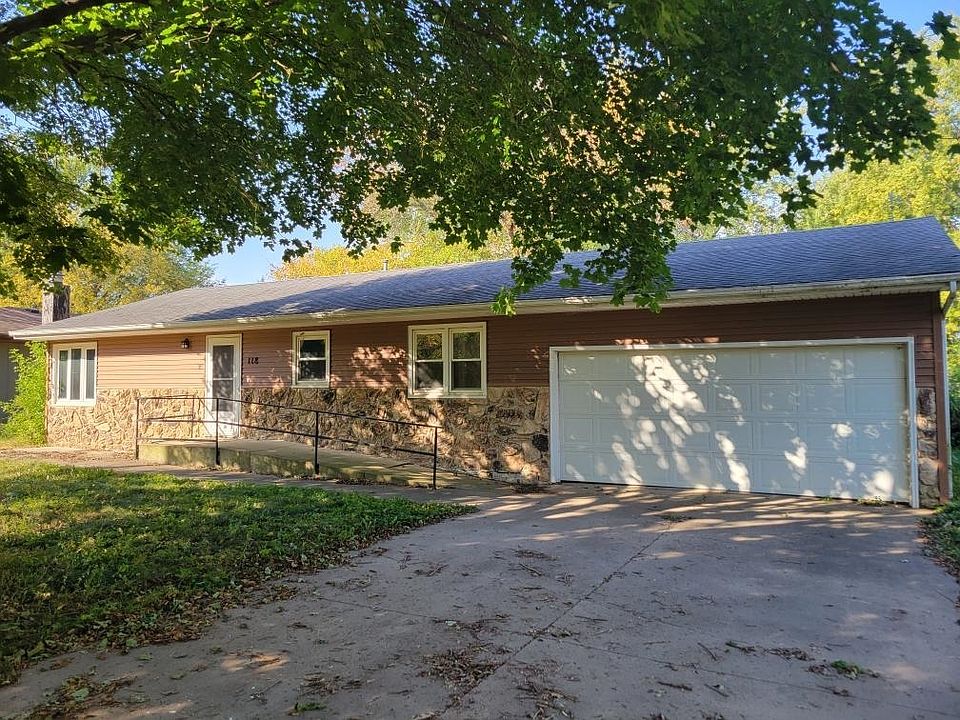 Welcome to small-town living with modern convenience! This ranch home offers zero-entry access with a front ramp, a spacious living room, and a large eat-in kitchen. The main floor includes 2 bedrooms and an attached double garage. A chair lift provides easy access to the basement, which features a 3/4 bath, two bonus rooms with closets (non-egress), laundry hookups, and a wide-open area ready for your finishing touches—flooring not yet installed, giving buyers flexibility to choose their own. The nearly ¼-acre lot features a storage shed and a newer roof, with low property taxes contributing to its affordability. Located in Fostoria, Iowa, this home is just a short drive to the Iowa Great Lakes, Spencer, and Emmetsburg. A practical and inviting opportunity for anyone seeking space and value in a friendly community!