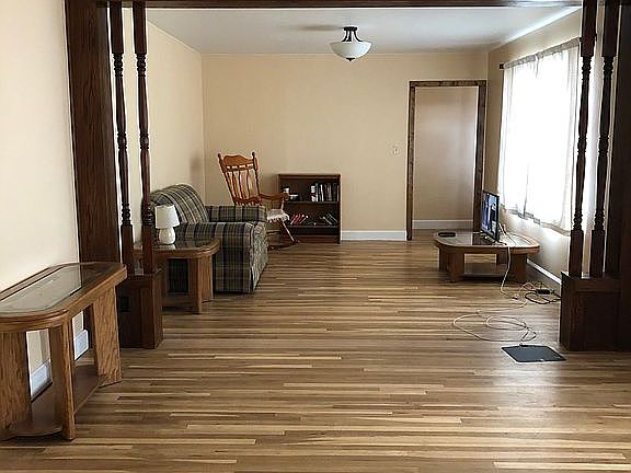 Beautiful brick downtown DUPLEX for SALE w/gorgeous, refinished HARDWOOD floors throughout ENTIRE DUPLEX, within walking distance of downtown businesses and grocery store. NEW ROOF IN 2017. SMALLER UNIT basement FAMILY ROOM REFINISHED! Larger unit boasts main floor w/two bedrooms, large kitchen w/newer vinyl flooring, and an incredibly spacious living room that could easily host both living room furniture and dining set w/room to spare! Downstairs you will find a utility room, separate room w/water heater/furnace, and third bedroom w/bathroom. Smaller unit has 2 BD, small eat-in kitchen, and 1 BA upstairs. DOWNSTAIRS you will find a large utility room, large room w/furnace, and bright, open family room! Both units share a common covered cement patio and an oversized single car garage,