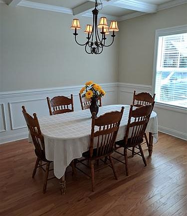 - DINING ROOM DESC: Wood Floor, Smooth Ceiling, Window Cov, Crown Mold, 9? Ceiling, Coffered Ceiling