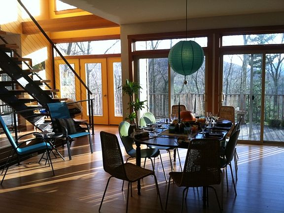 Location: Mount Tremper, Zip: 12457, in the Township of Woodstock, Ulster County, New York. Spectacular seasonal mountain views. Convenient to Phoenicia, Woodstock, supermarket, other necessities, and schools, while also being very private surrounded by woods. Just down the road is a NYC bus stop. Two story private residence, with attached two car garage. 9.79 acres extending to Beaverkill Creek. Size: Approximately 3400 square feet, plus approx. 1700 square feet of combined basement/garage. Rooms: 4 bedrooms (3 bedrooms with closets plus an additional library/guest room adjacent to full bath and with private access), 2 purpose-built offices, 3 full bathrooms all with linen closets, large open plan living-dining-kitchen-room with vaulted ceiling at front of house, plus TV room. Built in speakers in the ceiling of the big main living space (all four areas). It’s so cool to be able to plug in any of your music or even tv into that great sound system! Bamboo floors in open plan area and on custom staircase. Wood burning fireplace. Master bedroom has large walk through multi-closet area, en-suite bathroom with large jetted tub and separate shower, plus private deck great for star gazing. Two additional upstairs bedrooms, each with closets, easy access to second bathroom. Upstairs office has south-facing view of mountains, custom-built record/CD/book shelving, storage room at back, vaulted paneled wood ceiling. (possible to be made separate access). Extensive front deck has multiple access points from main floor, plus one from outside. Below the deck is a six person hot tub with beautiful seasonal views. Sizable backyard has fire pit, fenced vegetable garden and large flat play area. Side garden is perfect spot for a pool. The house is south-facing with seasonal passive solar heat on ground floor, air conditioning on upper floor, forced air cooling on first floor. Propane gas forced heating throughout, including basement and garage. Has Wifi, internet, cable TV. Heated basement is plumbed for an additional full bath, has a large games/play space, has a passive limited temperature wine room, large storage room, furnace, hot water heater, and well water pump room, spacious mud room style entry from garage and front door, ideal for entry from skiing and outdoor sports. Two car attached, heated garage. Going direct into your car in the garage means never having to remove snow from cars or get into a hot car in summer.