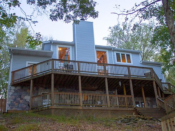 Price Reduced-SELLERS MOTIVATED!! Magnificent Waterfront Property! Savor your own piece of Paradise with the Breathtaking views of the lake! This wonderful home is situated on a beautiful wooded and serene lot with 148 ft of waterfront. Massive multi-level deck for your personal retreat & entertaining, with stairs leading down to your private dock. Welcome a quiet evening on the lake on the conveyed 14' pontoon or just sitting lakeside enjoying a bon-fire. Inside you will also take joy in the views of the lake from almost every room! Enjoy your breakfast in the eat-in kitchen while watching the wild-life or nestle up in the family room by the floor to vaulted ceiling stone fire place. The abundance of windows in this great home provides an overflow of natural light throughout the house. Bedrooms are all spacious w/ great closet space. Basement also has wonderful views of the lake with glass door to 2nd level of deck & includes a kitchen-can be used as in-law suite. Call today!