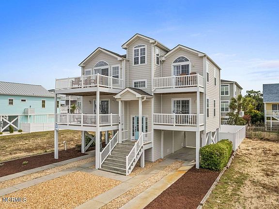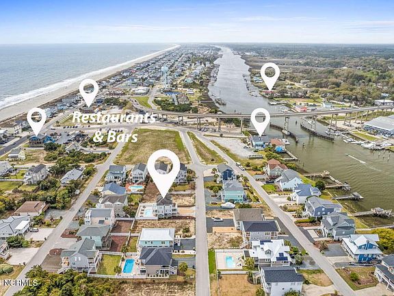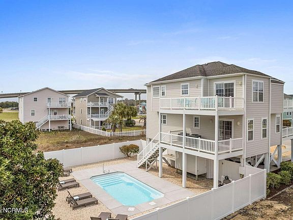 One of the best locations on Holden Beach! Beautiful views of the bridge, Intracoastal waterway, gorgeous sunrises & sunsets. Just a short walk to beach access (two blocks!), on-island restaurants, Bridgeview Park (pickleball & basketball), festivals, summer concerts & more. Updated throughout w/all new luxury vinyl plank flooring, freshly painted inside & out, new fixtures & furnishings. Open reversed floorplan on upper-level w/fireplace & vaulted, beamed ceilings. The kitchen has all new cabinets & pantry with slow close & roll out features, quartz counters, modern tile backsplash, new appliances & large kitchen island w/storage & breakfast bar. Balconies off GR & DR for outdoor entertaining & al fresco dining. Primary bedroom on upper level has new tiled shower, free-standing tub, dual vanity & private deck. Loft area off main level has two futon style sleeping sofas & waterway views. The main level features another primary suite & two additional guest bedrooms- each one has a balcony w/view! Laundry room & owner's closet on main level. Brand new saltwater pool & privacy fence installed in 2024. Outdoor shower & ample parking. Home sold furnished and kitchen is well-stocked, It's the perfect beach house & location to enjoy all Holden Beach has to offer!