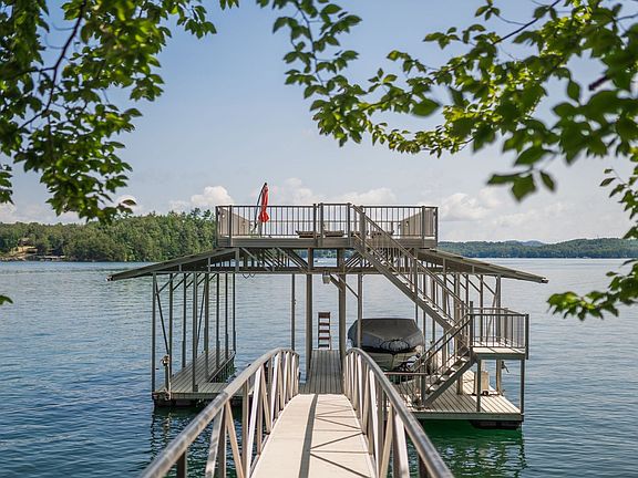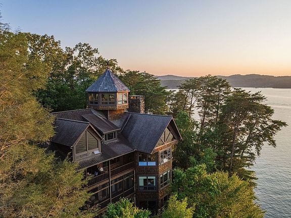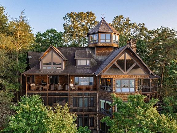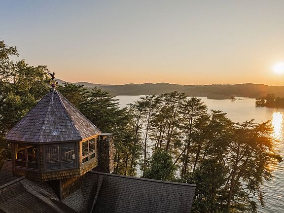 Situated on one of Lake Blue Ridge's most sought after peninsulas, this bespoke lakefront lodge is a unique opportunity to experience a luxurious lifestyle in the area's most iconic home. With scale and presence perfectly positioned on the lakeshore, this home offers stunning panoramic sunrise and sunset views of both the sparkling waters and mountains. With year-round deep water, a lot that offers complete privacy, and sprawling deck space, this home is the crown jewel for those seeking an exceptional lake retreat.There are four bedroom suites with space for large families and guests. The many porches and covered decks offer great space for entertaining, and for those who'd prefer to relax, they can find themselves on the screened in porch complete with swinging beds and a masonry fireplace. The main living area is situated between a beautifully crafted stacked stone fireplace and a wall of glass windows that lookout onto breathtaking views. A custom Canadian Log staircase spanning five levels is wrapped around a single continuous tree trunk. This enchanting "tree house" experience is one of a kind and adds to the home's notoriety on the lake. Additionally, this home sits on the farthest point of the peninsula behind a gated drive, with an observatory tower, double slip two-story dock, two car garage, and sold fully furnished -- you do not want to miss this fabulous opportunity to experience the magic of Lake Blue Ridge at 118 Charlotte Drive.