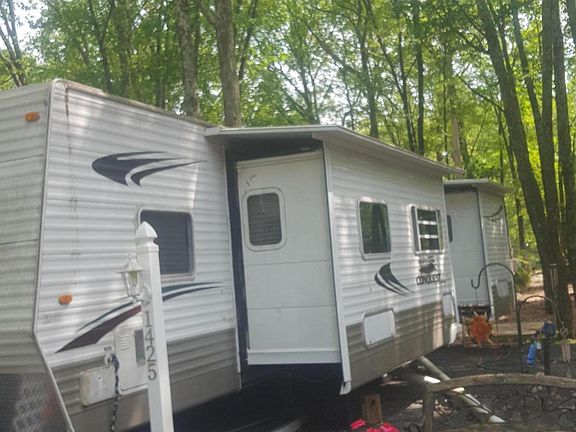 2008 GULFSTREAM CONQUEST 36FRS,CENTRAL HEAT/AIR AND 30000 BTU FURNACE.12 X12 PATIO PLATFORM DECK, 8x10 SHED. 2 BEDROOMS, SLEEPS 8 TO 10.QUEEN SIZE BED (NEW) BUNK BEDS,2 COUCHE(S) OPEN INTO FULL BEDS.ALL INCLUDED 12x20 HARDTOP 3 SEASON SCREEN HOUSE, 8X10. ALL FURNITURE INCLUDES,TVsAND FULL SIZE REFRIGRATOR. CLOSE TO ALL SEASONAL AMENITIES.