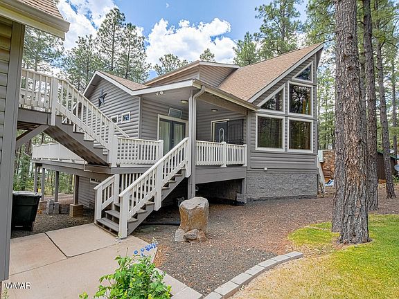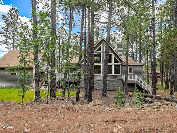 Enjoy Arizona mountain living at its finest with this amazing 4 bedroom, 4 bath cabin located in desirable Sky Hi Retreat. Nestled among trees on a spacious lot at the back of the community, this home features plenty of room inside and out. With a large great room, breakfast bar, hickory cabinets, granite counters, stainless appliances and stone fireplace with insert as well as an extra family room downstairs - this home is perfect for entertaining! The master suite has a huge walk-in closet and stunning bath with separate tub and shower. Walkout basement adds lots of additional living space and the property includes an RV parking area plus 4 car garage. Enjoy hiking, golfing, skiing and fishing just minutes away from the trailhead or relax on the maintenance free wrap around deck while taking in all the beauty of Arizona nature. This one won't last long - schedule your showing now! Feel like you are on vacation every day with this amazing cabin at Sky Hi Retreat!