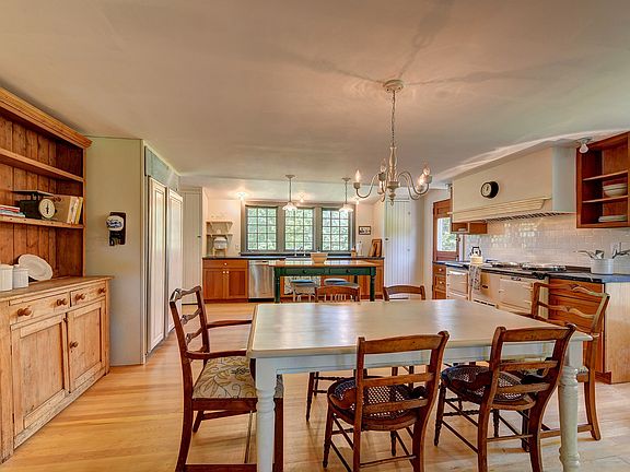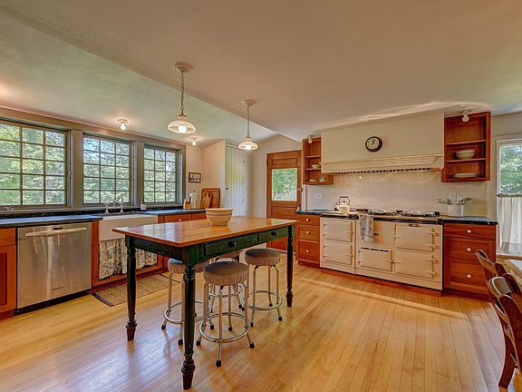 Charming home with many updates....including 2 steel I beams in kitchen/living room, front porch rebuilt, new roof, new storm windows, FIBER FOR INTERNET, new septic, new water softner, propane hot water heater, ...open living, dining, kitchen....Aga stove, sub zero frig , wonderful warm wood floors, gas stove insert in fireplace, wonderful light and bucolic view at the rear of the home. Potential first floor bedroom and bath, large mud room/ laundry room off of the double garage...three bedrooms and two baths on the second floor....much original charm....both front and back porches to enjoy summer breezes!