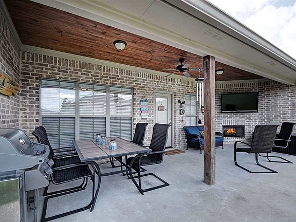 Lovely home with 4 bedrooms and two baths. Formal dining and large covered patio with fireplace equipped with gas logs. TV outlet also on back patio. Fenced back yard. Open kitchen and living area with hardwood floors. Carpet only in one bedroom downstairs and upstairs bedroom/bonus room. The upstairs bedroom also has a separate AC unit and a large walk in closet. Master bath has separate shower and double vanities. Master bedroom has vaulted ceiling of wood. Kitchen has w/slab granite, gas range, lots of cabinets and cubbies, Computer area and center island with breakfast bar. Washer, Dryer, and fridge remain. Window treatments to remain.