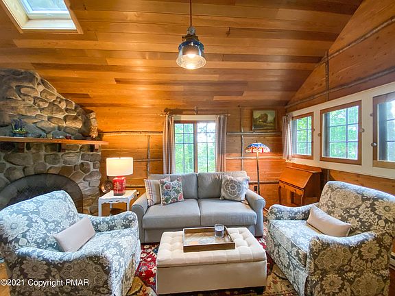 Welcome to Rose Cottage, a 1902 cedar cabin, lovingly restored and modernized while retaining its rustic charm. This work of art, stamped with flourishes by a local artist, lies at the foot of the old Buck Hill Inn historic site (now a community park), tucked in the woods yet walkable to all Buck Hill Falls amenities. The main floor has a vaulted ceiling and cedar walls overlaid with birch branches. The original stone fireplace and hardwood floors remain, while copper accents are found throughout including in the updated bathroom. Kitchen includes soapstone counter and sink, new stainless French door fridge and 8-seat counter-height island. Recent improvements include mini-split heating and A/C, plumbing, electricity, insulation, roof, 2 skylights and outdoor shower. Sold fully furnished.