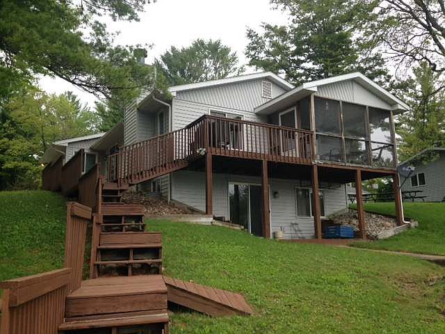 $186,000 sales price inc Outlot A across Rd SECORD LAKE WATERFRONT HOME that offers more! Year round home since built in 1994, 1380 sq ft each level, Master bedr and TV room/den & 1 full bath on main plus laundry. Kitchen-Dining updated 2012 w/Hardwood floors & granite counter tops. Custom Amish built cabinets. Gas Log Fireplace & screened in sun porch overlooking your 86' sandy frontage. Wood decking walkways & permanent dock. walkout lower level has large family room, addn'l large bedroom, large bath, cedar lined WI storage closet and 16x32 all purpose storage/mechanical room with small 2nd kitchen, office area, hobby CRAFT area/GREAT ALL PURPOSE ROOM!
