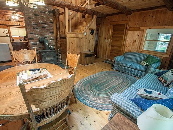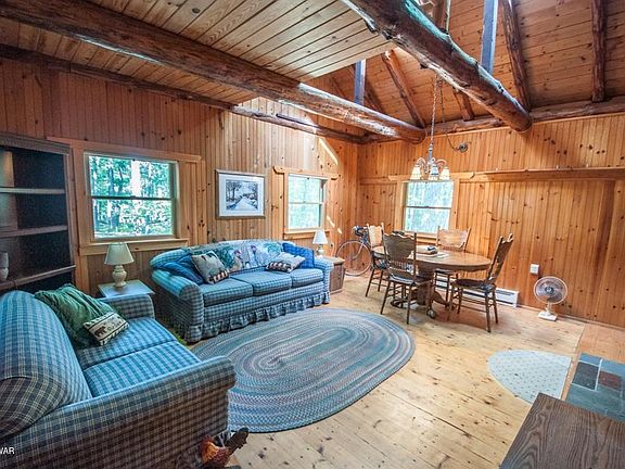 TRUE LOG CABIN! Enjoy mountain living in this 2 Bedroom, 1.5 bath perfect peaceful & relaxing retreat set on 2.73 acres. Enjoy this private cabin setting with vaulted ceilings, a T&G interior, hardwood floors, log beams, a loft and skylights to let the sun shine in. Cozy up to the living room brick wood/coal stove for chilly winter days. This home has a NEW septic system w/adjoining land available! Furniture & contents in house included. Sale includes 3 lots total. House is on one lot and the two lots next to the house.