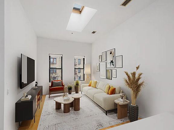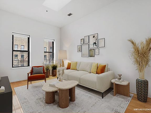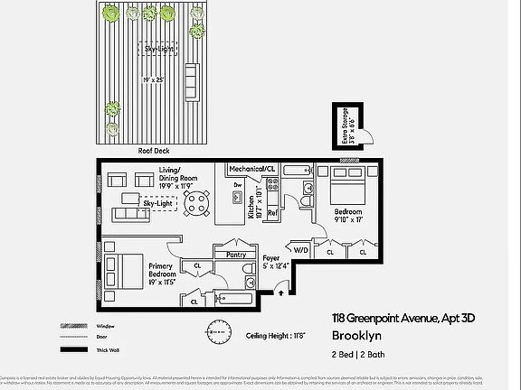 Welcome to Apartment 3D! Perched on the top floor of this elevator building, this stunning two-bedroom, two-bathroom apartment offers 1,026 square feet of thoughtfully designed living space along with 427 square feet of private outdoor space and in-unit washer/ dryer. With soaring ceilings over 11 feet high, multiple exposures, and skylights, this loft-like residence is flooded with natural light, creating an open, airy ambiance that feels both modern and inviting. The true showstopper is the expansive 427-square-foot private roof decka serene escape with breathtaking views of the Manhattan skyline. It's the perfect setting for entertaining, relaxing, or enjoying front-row seats to the iconic July 4th fireworks. Additional highlights include custom-designed California closets, a Nest Smart Thermostat for effortless climate control, and a smart light system. This apartment truly delivers on style, comfort, and convenience. 118 Greenpoint Avenue, also known as Canvas Condominiums, is a residential building located in the Greenpoint neighborhood of Brooklyn, New York. Originally constructed in 1931, this pre-war building was later converted into condominiums. It comprises 15 residential units spread across three stories. Residents benefit from amenities such as central air conditioning, bike storage, and access to a common roof deck. Situated less than a block from the G train station and two blocks from the waterfront, 118 Greenpoint Avenue provides convenient access to public transportation and local amenities.