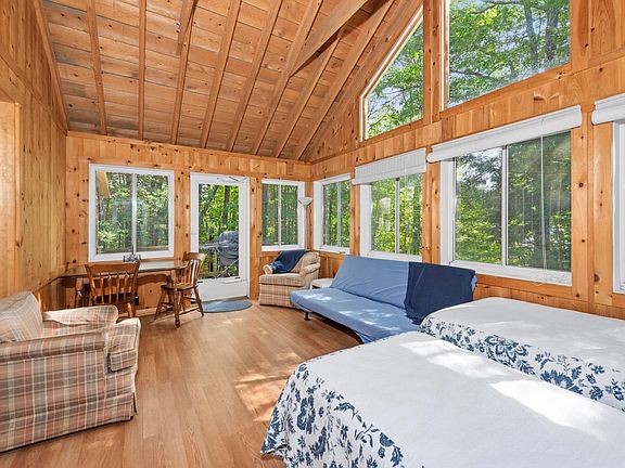 Do you want a place to get away and access to a beach without the large price tag? Come check out this well maintained seasonal cottage, located only one mile from Hebron Memorial Beach at Newfound Lake and four minutes from Sculptured Rocks Natural Area, known as the “New Hampshire Grand Canyon”. Situated on a one acre lot, the cottage offers different options for layouts, with a large living room and great room with cathedral ceilings, kitchen, one bedroom and a sleeping nook up the ladder, plus a full bath. Outside is low maintenance, with a drilled well and septic, plus a detached garage for additional storage, or possibly a bunkhouse. Taxes are less than $1,000/yr! Come check it out and image the possibilities!