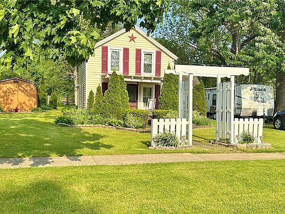 Nestled on a lush 1-acre corner lot in the village of Wilson, this charming 1855-built home exudes timeless allure. With a cozy 1027 sq ft footprint, it offers intimate living spaces steeped in historic charm. The home is framed by mature trees & exudes a storybook appeal. Inside, original new laminate floors create an inviting ambiance. The large living room offers a relaxing space with plenty of room for your furniture, perfect for entertaining family and friends. A quaint kitchen boasts vintage cabinetry and modern amenities. The adjacent dining area overlooks the picturesque backyard, offering a serene backdrop for meals. The first floor also features a cozy den/office. Upstairs, two snug bedrooms provide peaceful retreats. Outside, a sprawling yard envelops the home, ideal for gardening or leisurely strolls. Also features a large deck and new oversized shed/barn. Just 1000 ft from Lake Ontario's pristine shores and Wilson Harbor's bobbing sailboats, residents enjoy easy access to waterfront activities and breathtaking views. This idyllic abode is a haven of historic charm and tranquil beauty.