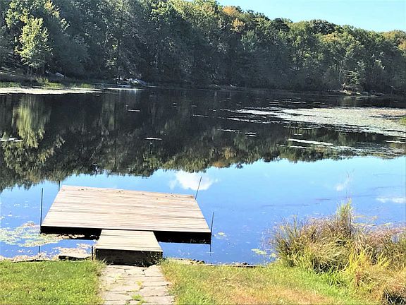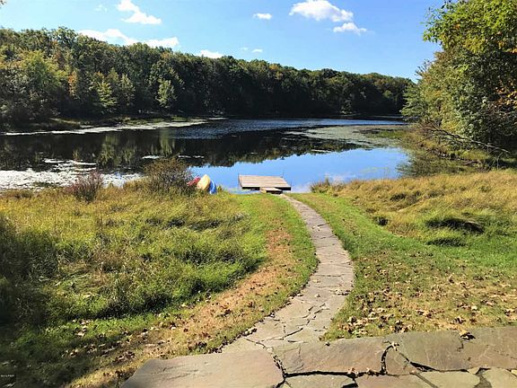 Spectacular lakefront home privately set on 1.20 acres with an incredible view, including extensive lake frontage and at end of a quiet cul-de-sac. Home is updated and well maintained, featuring open floor plan, hardwood floors, vaulted ceiling w/skylights. Updated kitchen with granite counter tops, attractive back splash w/stainless steel appliances. Open living area has marble faced propane fireplace complimented with extra large sliding doors providing a magnificent view of lake. Finished basement updated with ''wood look'' tile floors, includes a family room overlooking lake, an additional room, large laundry room & storage area. Property has a wonderful patio for entertaining & evening fires. Detached 1 car garage w/new roof. Walk to tennis courts and community beach. 90 miles to NYC