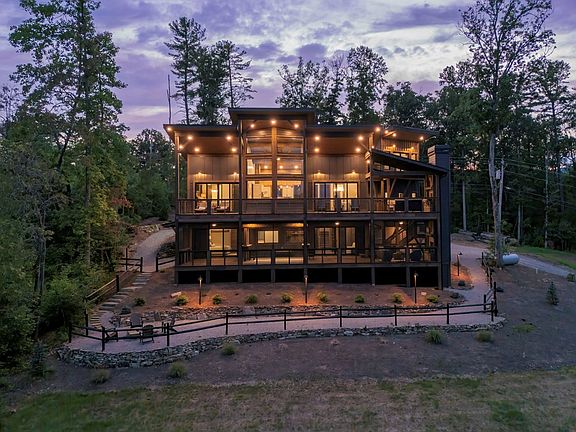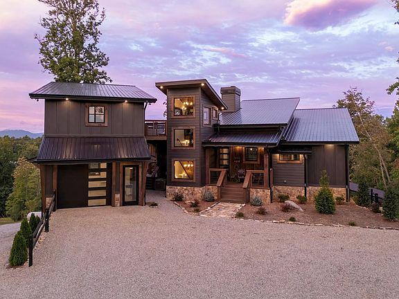 Discover this newly priced luxury residence, now available at its recent appraisal value. Nestled in a serene setting with tranquil creek frontage and breathtaking mountain views, this distinguished new construction offers the perfect blend of elegance and nature. The home features 4 spacious bedrooms, 4 modern bathrooms, that includes a luxurious king studio suite perched above a 1-car garage. The suite comes complete with a full bath, private balcony, and direct access to the main house, providing a perfect retreat for guests or family members. Step inside to experience the architectural grandeur of soaring ceilings, expansive glass walls, and a cozy fireplace that invites you to unwind. The gourmet kitchen is outfitted with stone countertops, premium tile, and high-end stainless steel appliances. The living space flows seamlessly to the massive screened-in porch with a fireplace, perfect for year-round entertaining .Outside, the 3-acre gated estate is a visual delight, featuring meticulously landscaped grounds, stone walls, vibrant plants, and winding paths that lead to a peaceful creek and fire pit area. This property offers a private sanctuary just minutes from town. For those seeking even more space, an additional 3 acres is available for purchase. Experience unparalleled living in a setting that truly captures the essence of luxury and nature.