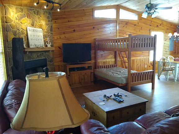 Cozy & inviting describes this one of a kind cabin boasting white pine ceilings and walls in the great room. Wood Burning Stone F/P made from the stones from the property where cabin sits. Community has private boat launch and is a golf cart friendly community. Home is located on a large corner lot. Home is not on the water, it offers Lake life at a fraction of the price. Furnished and move in rea