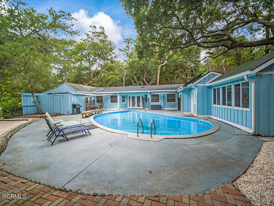 Nestled among the Live Oaks in the heart of Pine Knoll Shores, this fully renovated and furnished, one-level, home boasts coastal living at its finest. Inside you're welcomed with open living spaces including a double-sided fireplace, formal living room, spacious kitchen and a great room with plenty of windows and french doors that lead you outside to your own private backyard oasis. You must see this home to appreciate the well appointed finishes and updates throughout. The remodeled kitchen includes quartz countertops, large island, farmhouse copper sink, floating shelves, tile backsplash, all new stainless steel appliances and a wet bar. Off the kitchen is the primary bedroom with a fully renovated ensuite offering a double vanity sink, tile floors and a well designed walk in shower. The laundry area and bonus room also included on this side of the home. The other two bedrooms and the second full bathroom are located on the opposite side of the home, providing ample room and comfort. The split floor plan would work well for an in-law suite or airbnb. Step outside and bring your creative, finishing touches to the backyard with bamboo and mature trees all around you to enjoy. The in-ground pool and patio is perfect for grilling and relaxing. There is an additional 267 sq. ft. of unfinished space in the back with a separate entrance ideal for a recreation room. Tucked back off the road, with all fresh landscaping and rock accents, the entertaining space inside and out is boundless with this home. Being a part of the Pine Knoll Association, you gain private beach access with parking, marinas, boat ramps, parks and playgrounds. This area is home to the NC Aquarium and is close to the Crystal Coast Country Club. Life at the coast doesn't get any better than this!