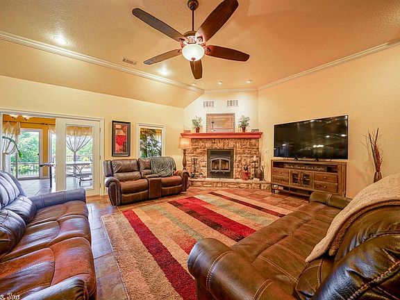 Stunning family retreat on 5 acres! Split bedroom plan with gorgeous flooring. Wonderful vista view from Arkansas Room or large deck. Warm kitchen with beautiful cabinets with pullouts, and Kenmore propane stove. Wood burning fireplace, separate water heaters for each bath. Oversized garage and shop with a restroom and RV cover. Bright and cheery! Adorable guest house on property with sweet kitchen and bath. Sprinkler system runs on well but house is on City water! Gated with security cameras. Call to See!