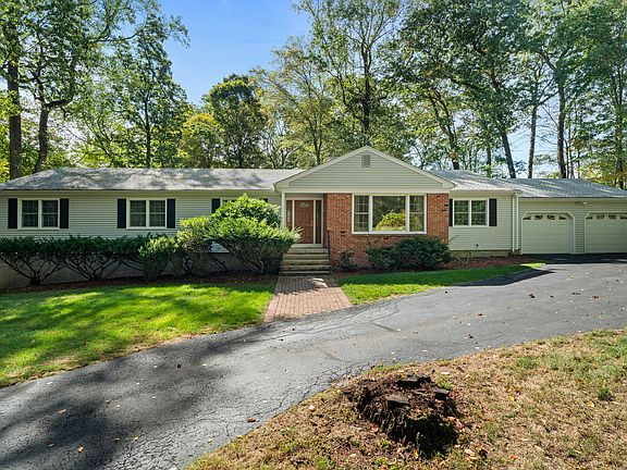 Stunning and spacious, this 4-bedroom, 3-bath ranch is perfectly situated at the end of a highly sought-after cul-de-sac in Central Woodbridge. Nestled on a private 1.41-acre lot, the property backs up to approximately 65 acres of protected land trust, offering serene views and convenient access to the Elderslie Preserve Trail system-ideal for outdoor enthusiasts. Inside, this meticulously maintained and updated home is filled with natural light and features a custom kitchen with Corian countertops, stainless steel appliances, and an adjoining breakfast room. The main level boasts four generously sized bedrooms with abundant closet space and hardwood flooring under the carpeting. Enjoy cozy evenings by any of the three fireplaces located in the living room, family room, and lower-level recreation room. The finished walk-out lower level adds approximately 1,582 square feet of versatile living space, including a rec room, 2 additional bedrooms & a full bath-perfect for multi-generational living or guest accommodations. Step out from the breakfast room onto an expansive wood deck overlooking the beautiful backyard, ideal for gatherings and outdoor fun. Notable improvements include a new roof (2010), Marvin windows (2012), vinyl siding (2012), renovated baths (2016), a whole-house Generac generator (2012) & a new AC coil and condenser (2019). Located in an award-winning school district with convenient access to Yale University, downtown New Haven, Shopping and major highways.