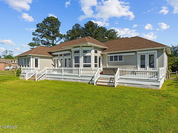 Imagine yourself living your best life on almost an acre overlooking the Neuse River in desirable Cypress Bay. Towering floor to ceiling windows along the entire riverfront side of this home will beckon you to the captivating water views. This home has been meticulously maintained and designed for ultimate comfort and protection. Hardwood flooring, high ceilings, a fireplace, built-in cabinetry and a surround sound system are featured in the main living and dining areas of the home. Elegant kitchen has gas cooktop, granite counters, glass-front cabinets, pantry with pull-out shelves and a breakfast nook. Pamper yourself in the roomy master suite with a separate sitting/dressing area, 2-person infrared Sauna and two walk-in closets. A 286 sq. ft. bonus room over the garage is not included in the heated square footage but has its own HVAC and offers lots of possibilities for hobbies, home theatre, fitness or office space. Plenty of storage in the partially floored attic. Home has so many special extras including a 14KW generator, roof with a lifetime warranty, heated garage space, electric hurricane shutters, large fenced backyard, awnings, hot tub and more. All appliances convey plus a 286-bottle wine cellar in the dining room. Cypress Bay community amenities include 200-300 yards of beach, a boat ramp, and dock with sunset seating. Come enjoy your front row seat for all of the wildlife and boat activity on the Neuse River.