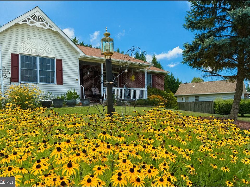 One-story ranch home with NO HOA fees! This spacious split-bedroom layout offers 2 bedrooms and 2 full bathrooms conveniently located on opposite sides of the home for privacy. The property boasts a BRAND NEW ROOF, a FULLY FINISHED BASEMENT with an ADDITIONAL HALF BATH, plus extra storage space. The main floor showcases a large living room, separate den or dining room, and eat in kitchen leading to a covered deck overlooking the VERY PRIVATE BACK YARD! You will have plenty of room for furniture in the HUGE PRIMARY BEDROOM! Enjoy the convenience of FIRST FLOOR LAUNDRY, a two-car garage, and an enormous shed for all your needs. The front porch is perfect for relaxing and taking in the view of the beautiful flowers and gardens that surround the property. Located in a quiet development with sidewalks, this home is ideal for peaceful walks. Close to the PA and MD border too! With potential for RV parking and plenty of charm inside and out, this home checks all the boxes!