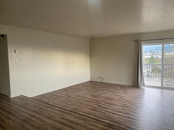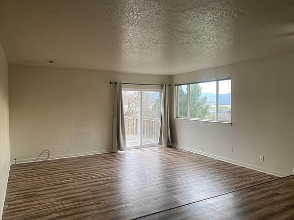 Tentatively available Early March. 2 pets (35LBS or smaller) may be considered with an additional $500.00 deposit per pet and $35.00 pet rent. This is a large upstairs 2 bedroom 1 bath duplex located in Roseburg. There is vinyl plank flooring in the living room and bedrooms. The kitchen includes a refrigerator, electric range dishwasher, and garbage disposal. Off of the living room is a sliding glass door that leads to a porch. This unit includes a single-car garage and a laundry room with washer and dryer hookups. This home is heated with electric ceiling heat and the living room has a wall AC. The water sewer and garbage are included, and the tenant is responsible for electricity and ground maintenance. This is a 1-year lease and rental insurance is required. This is a nonsmoking property. The owner pays for water, sewer, and garbage. The tenant is responsible for electricity and landscaping. 2 pets (35 LBS or smaller) may be considered with an additional $500.00 per pet and $35.00 pet rent. This is a non-smoking property.
