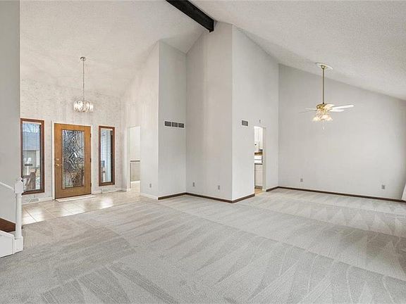 Welcome home to Nelson Square! This large side to side split level home features brand new carpet throughout, a grand vaulted ceiling in the great room, updated kitchen counters + backsplash with main floor laundry. The primary bedroom features an en-suite, a large walk-in closet, and private deck. Relax in secondary living area by a cozy gas fireplace featuring a sliding door with backyard access that is fully fenced-in. The lower level features built-in shelves, half bath, and large oversized cedar closet. Oversized two car garage with plenty of storage. Home is in close proximity to neighborhood pool, and walking trail.