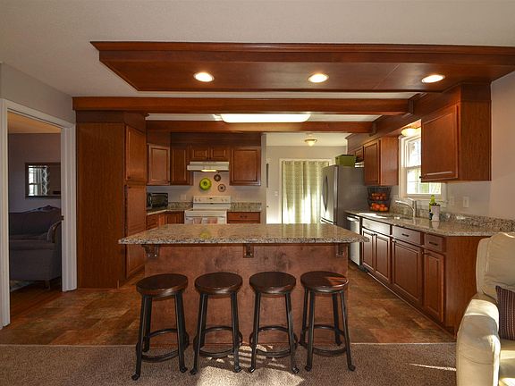 - RoomKitchenFeatures: Granite Counters, Kitchen Island, Recessed Lighting, Floors-Vinyl, Cabinets-Stained