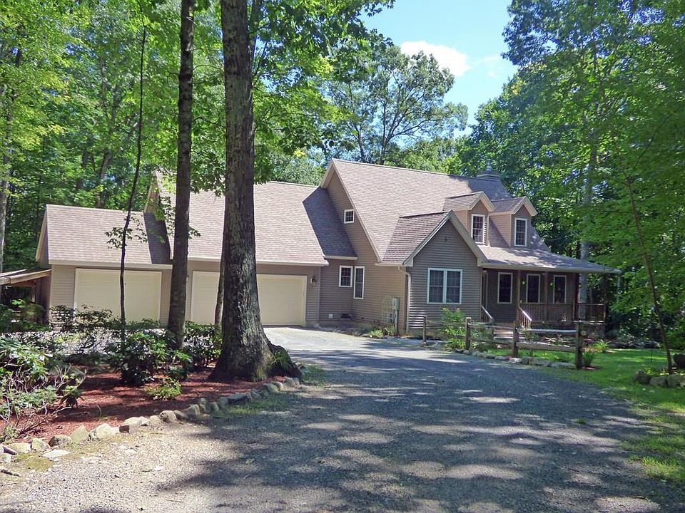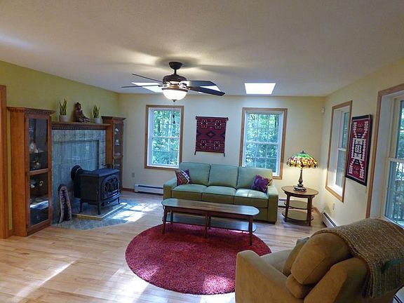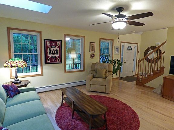 Experience the bountiful natural light throughout this well appointed Contemporary. The vaulted foyer welcomes to the living room with cozy wood stove and skylights, a seamless flow to the formal dining room & updated kitchen, making for the ideal entertaining experience. The kitchen eat in dining opens to a three season porch and deck overlooking the bucolic rear yard. The beautiful first floor master suite, custom walk in closet, generous master bath with double vanity, provides convenient single level living! The first floor laundry/mudroom leads to the three car garage! The second floor has two spacious bedrooms, each with en suite baths. Additional office space plus bonus room for future finishing. Partially finished area in the walk out basement. Private and peaceful setting 3+ acre lot to enjoy a soak in the hot tub or entertain. Easy access to major routes, Rte 5 & 10, I 91, minutes to Northampton center. A very special property!