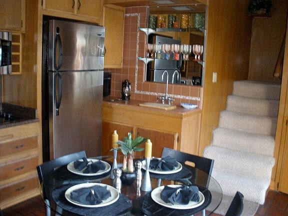 Two story Guest house has 1 queen bed, love seat, 2 armchairs and 2 side tables in the combination living room/bedroom, built-in bunk beds, bathroom with shower and a gas fireplace upstairs and a foldout queen sofa bed and a gas fireplace downstairs in the dining /kitchen/wet bar area with another bathroom with shower on the lower level. Located near the Balboa Island Ferry, where you can cross to the Balboa Peninsula to discover the many restaurants and various other activities (boat rentals, tours, arcades and the ocean). Stroll the boardwalk around the Island and enjoy the bay front beaches and a charming downtown area where you can shop and dine. Rental includes a carport and there is a swimming pool (not Heated in winter) and built-in gas bar-be-que on the property. Patio/Pool/BBQ area shared with owners next door. Cable TV, DVD player, Cable/Wireless Internet access and Utilities (gas,electric, water) are included. Linens and towels are provided. Best suited for single person. Sorry, no pets. Available beginning September 15th thru June 15th 2025. Looking for a 9 month rental No month to month. There is no washer & dryer on the premises but the laundromat is on the next block. Utilities are included up to $150 per month on gas and $250 per month on electricity, water and trash. Any overages on gas and electric paid by tenant. This is a 9 month rental.