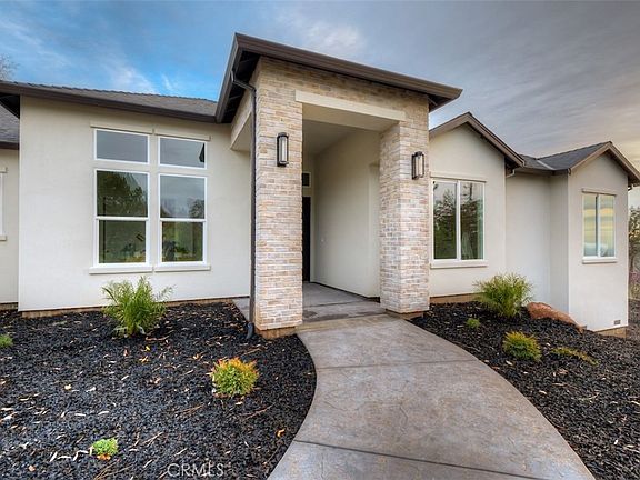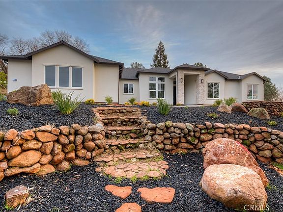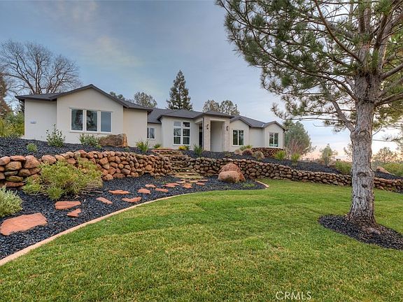 Welcome to this stunning estate located at the end of a court on one of Paradise's most prestigious roads, Valley Ridge Drive. Surrounded by custom estates and overlooking the Butte Creek Canyon, this home offers breathtaking views of the valley floor and beyond to the coast range. As you approach the property, you'll be impressed by the rock walls and grand double door entrance. Inside, the soaring ceilings with white oak wood beams and stylish matte black fixtures will take your breath away. The main living area is flooded with natural light and features a shiplap fireplace, built-in hutch with floating shelves, and plenty of space for entertaining. The spacious kitchen boasts a beautiful waterfall quartz island, ample counter space, a 48" black stainless Thor gas range, and matching black stainless appliances. A slider leads to the covered patio, where you can take in the stunning views. The kitchen also features a wet bar with a wine fridge and a walk-in pantry with wood shelving. The master suite is located at the back of the home, with a slider leading to the manicured backyard and a huge walk-in closet with built-in shelving. The master bathroom is generously sized and features a double sink vanity, an oversized walk-in shower with dual heads, and a soaking tub for ultimate relaxation. The laundry room offers gas/electric dryer hookups and plenty of counter space and storage. There are two spare bedrooms with walk-in closets at the front of the home, as well as a full bathroom and a guest bath off the main living area. The fourth room, which could be used as an office, has double doors from the entry and 12' tall ceilings. The backyard is beautifully landscaped with rock garden beds, iron fencing, and a stucco wall enclosure to hide trash cans and other yard storage. This address also qualifies for a standard Farmers Insurance policy-potential buyers to verify. Don't miss your chance to see this impressive home – schedule your private showing today!