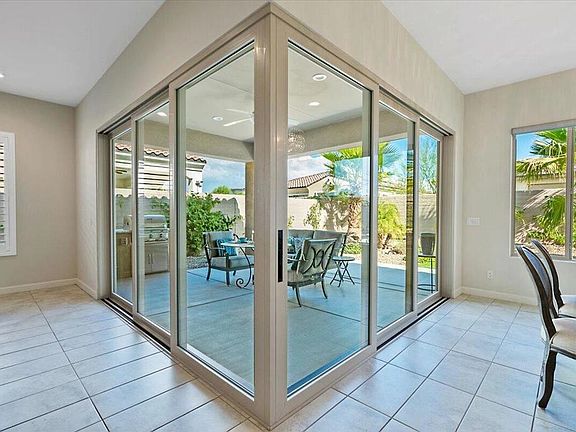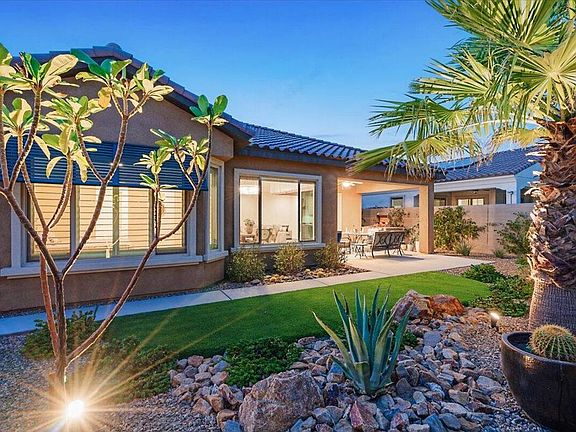 The Desert's newest and best 55+ community Del Webb Rancho Mirage - offering best in class amenities with world-class shopping and dining nearby + easy access to PSP and Palm Springs! This Tuscan SANCTUARY plan featuring 2 Bed/2 Bath with a Den/Office, private east facing custom landscaped backyard with southern and northern mountain views, spacious covered patio with built-in Gas Grill; OPEN CORNER SLIDING GLASS DOORS; 12 x 24'' porcelain tile floors throughout; custom window coverings; arch package; 42'' upper cabinets in the kitchen in Stone Gray; Quartz counters in Maple White; 60/40 split granite composite sink; Whirlpool appliance package - including refrigerator, washer and dryer. The Owner's bedroom was expanded two additional feet with the BAY WINDOW OPTION. The inside laundry room keeps everything tidy with added upper cabinets, while the guest bathroom is ready featuring a shower over tub combination. Easy and affordable SOLAR LEASE ($58.53/mo); in PHASE 2, and blocks from the Outlook Clubhouse facilities - makes this home a great opportunity!