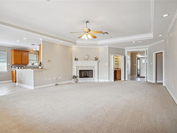 THIS PRISTINE WATERFRONT SANCTUARY HAS REMARKABLE WATER VIEWS. *** EXTRAS...Double insulated windows, underground drainage, insulated garage door, 60 FT OF SOLID DOCK & bulkhead, 2 NEWER A/C UNITS in 2017 & NEW ROOF 2019 *** The house unfolds over a generous 2466 sq ft living area, featuring 9-10' CEILINGS enhancing the spaciousness of the rooms. The heart of this home is its BRIGHT KITCHEN, where the enjoyment of cooking is elevated by breathtaking DOWN WATER VIEWS. Imagine preparing meals as you gaze out onto the TRANQUIL WATERS, with sunlight reflecting off the surface and filling the space with natural warmth. The kitchen boasts solid cabinets with 48" uppers and two convenient lazy Susan's, breakfast bar seating, a new wall oven and an oversized pantry. The corner fireplace adds warmth and character to the HUGE 19' x 30' DEN that features a step ceiling, elegant crown molding and BUILT-IN BAR creating an ideal environment for relaxation or hosting gatherings. LARGE BACK PORCH extends the living space outdoors, where built-in seating & surround sound invites moments of tranquility or social enjoyment in the afternoon shade. The split floor plan ensures privacy and comfort for all residents. The PRIMARY SUITE is an OASIS OF RELAXATION, complete with two walk-in closets for ample storage and a step ceiling that adds architectural interest. Its en-suite bathroom features a garden-style tub and an oversized shower, promising a spa-like experience every day. Two additional spacious bedrooms offer versatility and space for family or guests, each benefiting from walk-in closets and sharing access to a well-appointed bathroom. A large extra hall closet provides further storage solutions. The covered dock has water for fish cleaning; direct access to NAVIGABLE WATERS.