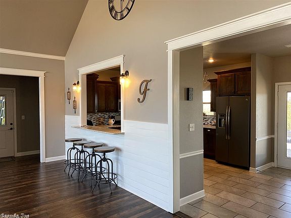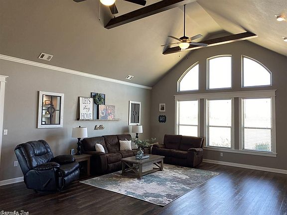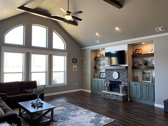 Beautiful custom home with many custom features. High vaulted ceiling with wood beams in large living area. Stone hearth fireplace with gas log & shiplap details with open wood shelving. Split bdrm floorplan with private hall to master suite. Master bath has a beautiful custom walk in tile shower, double sink vanity, 2 master closets. Kitchen features shaker-style stained wood cabinetry with slate-finish appliances. Back patio has vaulted ceiling. Storm cellar & extra covered parking. See agent remarks.