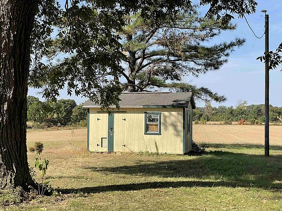 Cute, 2 bedroom 1 bath farmhouse with covered front porch and open, back deck. The nice 1.7-acre lot, surrounded by farmland and only 1 mile from the 4-lane, 104 W. Owner had the interior doorways widened to 32", replaced the front and back door, and installed and vapor barrier in the crawlspace when he purchased the home. Roof, microwave vent hood, electric range/oven, and water heater approx. 2 yrs old. Ameristar brand HVAC approx. 5 yrs old. Kitchen with lots of natural sunlight. Built-in kitchen wall pantry. All appliances remain, including the Maytag washer and dryer and Whirlpool refrigerator. The wired storage building stays. Mature trees. Wheelchair-accessible ramp to the front porch. Double closets in the owner's bedroom.