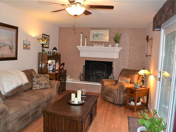 Enter from a 2-car garage to the kitchen or by the front door into an attractive 5' by 11' foyer with coat closet. Turning right leads one to the 3 bedrooms and 2 full bathrooms. Going left from the foyer leads one into the eat in kitchen. Going straight ahead from the foyer takes you to a fireplace accented living room with a sliding door to an attractive brick patio and nicely landscaped backyard.