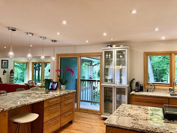This stunning Mid-Century Modern Walkout Ranch with Ravine Views in the West Lafayette School District offers a blend of charm and contemporary comfort. Nestled in a desirable neighborhood of West Lafayette near the Intermediate School, the Junior/ Senior High School, and the Purdue campus, this fully remodeled single-family home seamlessly blends mid-century charm with contemporary convenience. Bathed in natural light and offering captivating views of a serene ravine, this residence is a true testament to modern living. Key Features: 3 bedrooms with the potential to add a fourth; 3 bathrooms, including a luxurious master suite with his and hers walk-in closets, and an ensuite marble bathroom boasting radiant heat flooring; a Chef's dream kitchen with a spacious layout featuring two islands, stainless steel appliances, granite countertops, pantry, and ample storage space; formal dining room, living room, and family/media room with panoramic views, along with a custom library, office, and den with a fireplace. The house has been carefully remodeled to preserve the essence of mid-century style while incorporating modern amenities and finishes throughout. It's energy efficient and has a new furnace, new water heater, extra roof insulation, and new Marvin windows. The house is also equipped with Smart Home Technology: a Ring doorbell and a backyard Ring camera, as well as Nest Fire and CO alarms. Step outside to your private deck overlooking the ravine, ideal for morning coffees or evening gatherings. A paved patio and cozy firepit area offer the perfect setting for outdoor relaxation and entertainment. Embrace nature with a sunny garden in the front and a lush shade garden in the back. The house also features a spacious two-car garage with shelving and ample storage space. Experience the perfect marriage of mid-century style and modern sophistication in this meticulously updated home. Discover the epitome of contemporary living in West Lafayette.