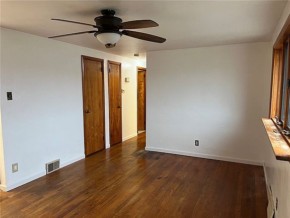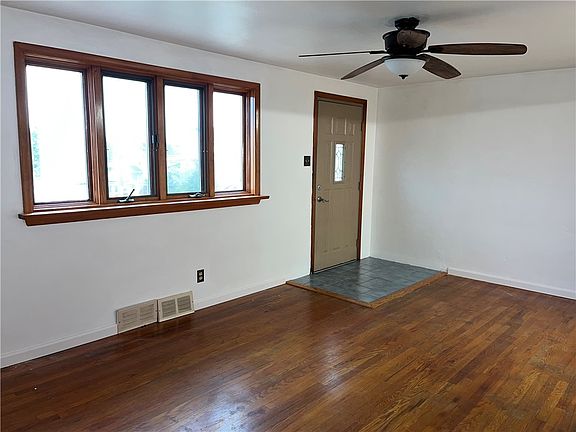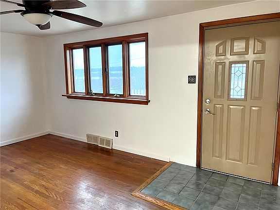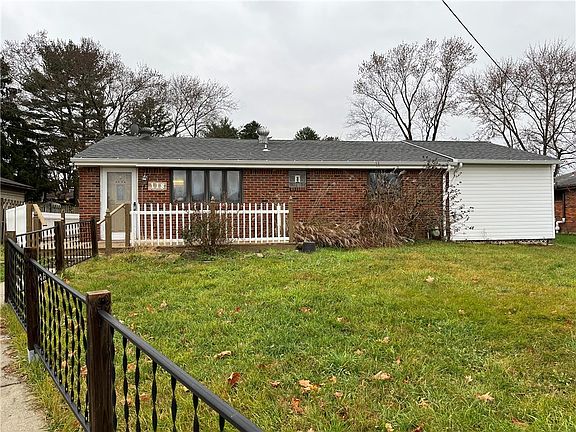 This 2 bedroom ranch home sits on a quiet residential street with easy access to 79! Enter through the front door to a living room with a 4 panel window that provides ample natural light. Hardwood floors lead you down the hall to a spacious laundry room equipped with a washer/dryer and countertop with cabinets for storage space. An updated bathroom and two well lit bedrooms are situated on the main floor. The roomy kitchen includes a gas stove and refrigerator with plenty of cabinets. An additional room in the back of house could be used for a dining or family room. With many windows and a sliding glass door that opens onto a wrap around porch and sizeable backyard. There is an addition with access through a manual garage door that could be used as a carport or storage. There is access from rear road to add parking spot or driveway to garage. Basement is partially finished with sights for additional bedrooms or other uses. There is a ceramic tile tub/shower in basement.