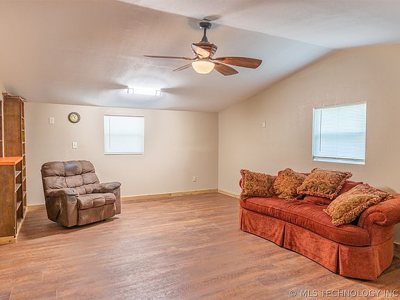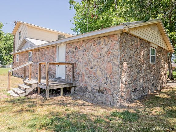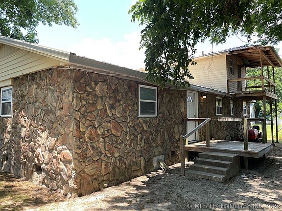 Quaint 3br, 2b, two-story home near downtown Checotah's local shopping and restaurants. This home includes a large living room with vaulted ceilings and a large eat-in kitchen area with an island bar. Updated flooring and carpet throughout the space. Master suite upstairs with full bath and balcony. All appliances (except refrigerator) convey. Sitting on approximately 0.6 acres, this property comes with a 52'x24' barn and covered parking. Property is being sold as-is.