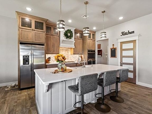 Stunning! This home is truly stunning! From the curb appeal to the front porch, to the gourmet kitchen, to oversized closets to gas fireplace with temperature controlled remote and gorgeous stacked stone, to unique fans with both wall switch operation and remote control in the living room, to 2.5 modern baths to the large patio it is just stunning! The finishes are upgraded, the tubs are deep soakers, the primary shower is oversized, there are two closets in the primary bedroom, a large laundry room, and the light fixtures are gorgeous... You really need to tour this home to appreciate it's beauty. This home has 4 true bedrooms plus an office. The living-dining-kitchen is an open concept with recessed lighting, double tray ceiling, large kitchen island with a farm sink, a nice-sized pantry, a 5-burner gas cook top, double ovens, built-in microwave, pot filler over the cooktop, accent lighting in the upper cabinets, under-cabinet lighting and wood-plank ceramic tile flooring. The primary suite is spacious with upgraded carpet and padding, upgraded closets with multiple built-in shelving and drawers, double sinks with white quartz counter tops, an whirlpool tub and an oversized walk-in shower. There are also custom heavy blinds on all the low-e windows The home is prewired with HDMI and speaker cable to central closet space with ceiling speakers in the open living-dining-kitchen area, primary suite, 3-car garage, and back patio with wall-mounted volume control in each area. There is also Wi-Fi network hardware, 2.0 and 5.0, from a central hub to repeaters in both the North and South hallways as well as a Wi-Fi garage door opener, a security system with window, door, motion, and glass-break sensors for notification chimes as well as alarm. As if the home didn't have enough interior amenities, the outside features programmable exterior lighting, well-loved landscape beds, a covered porch on the front, a large covered patio on the back as well as an extended uncovered patio and a paved walking path to take out the trash from the back porch patio, around the house to the fence-hidden bins near the driveway. This home also features some other wonderful amenities such as a whole-home water softener system, reverse osmosis drinking water system, propane gas outlet on the back porch for grill, griddle or heater connection, and a double-up-fit garbage disposal . This property is so amazing and sits on a 1 acre lot in the Cache School District yet is only a 7 minute drive from the shopping that includes Target, Academy Sports, TJ Maxx, Burlington Coat Factory, Bath & Body Works, The Buckle, Old Navy and more! Call Kim Thomas today for your tour of this stunning home, 580-704-9916.