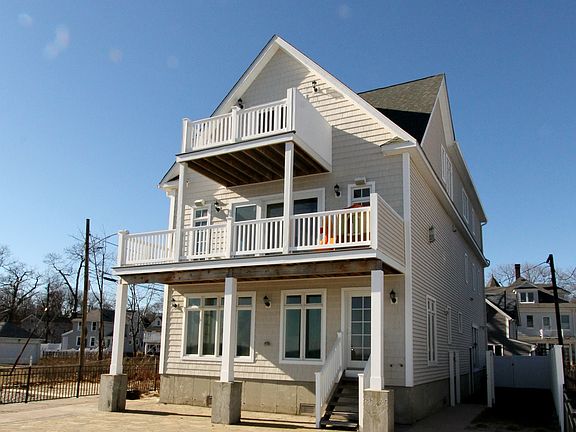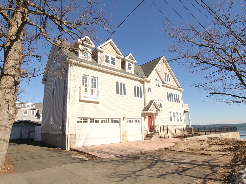 Direct Waterfront! Panoramic views of Long Island Sound! Feels like you are on a cruise ship! Not your typical beach house! Gorgeous home, built 2012, open floor plan, 9+ ft ceilings, tres ceiling in diningroom, custom moldings throughout, hardwood floors, open floor plan, bright kitchen, floor to ceiling cabinets, top of the line appliances, convection oven, pot filler and wine chiller! All the amenities for great entertaining! Main floor bedroom suite with Juliette balcony, full bath and plenty of closet space, main floor laundry room w/laundry sink and shelving, upper floor master suite with large outdoor deck overlooking the water, walk-in closet and full bath with water closet. Street level family room w/half bath, tons of closet space, pocket doors and french door leading out to oversized outdoor patio and to the water. Very versatile space! Also, 3 car garage, fenced yard, outdoor shower, and conveniently located to shops, restaurants and outdoor summer entertainment. Your guests won't want to leave! (Flood insurance transferable to new owner - Only $492/year)