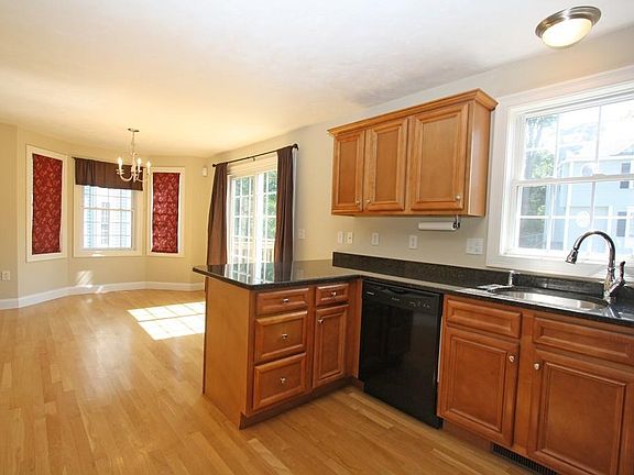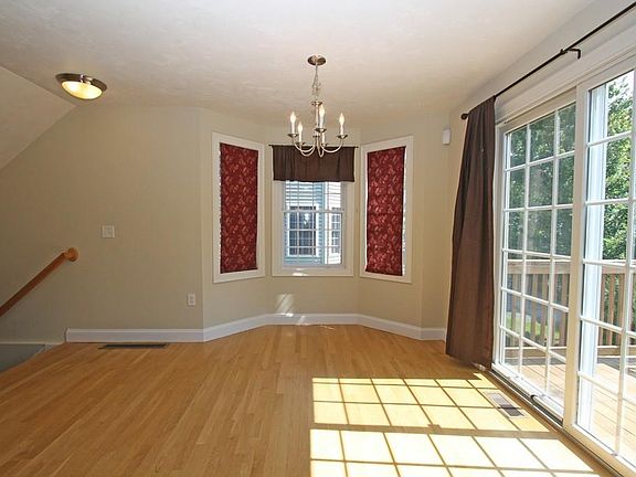 Meticulously maintained light filled end unit at Smithfield Crossing. Hardwood floors throughout kitchen and dining area. Updated kitchen with black appliances, granite counters and breakfast bar. Dining area has bay windows, slider to deck and is open to kitchen for entertaining. First floor in-unit laundry area and half bath with granite countertop. Large living room off of dining area. Upstairs hall way has a large sitting area which could be used as an exercise space, office, etc. Full main bath has granite countertops and double vanity. Huge master bedroom has double closets, beamed ceiling and ceiling fan. Third level is a large loft for extra living space. Both bedrooms and loft wired for cable connection. 2 car garage with large insulated storage area. Security system. Pets ok under 15lbs.