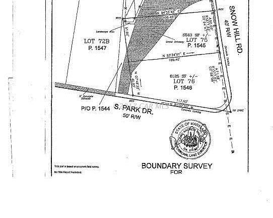 Motivated sellers. New survey conveys. Corner building lot has a nice view of Salisbury City Park. Great location and close to Zoo, abundant walking trails, tennis courts plus all year round Salisbury activities. Lot conveyance includes Lot 75, Parcel #1545. Total for both parcels combined is 11,688 sq. ft. Gravel Driveway enters from S.Park Dr. No impact fees.
