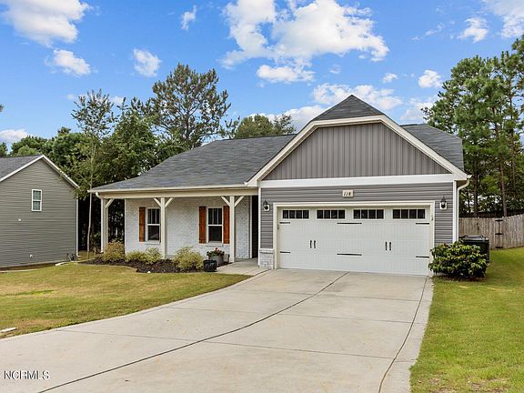 Welcome to 118 Star Court! The one story 3 bedroom 2 bath sits on a .28 acre lot in the Shepherd's Ridge neighborhood in Aberdeen. The long covered porch provides a space to enjoy the front yard on the quiet could-e-sac while the covered back patio provides a great space to sit and relax or grill and hang out in the fenced backyard. Inside, passing through the foyer, you have a vaulted ceiling in the living room with an electric fireplace, to the right you have the dining area and kitchen with ample storage and the pantry. To the left, you have a split layout featuring the primary room at the back of the house while the additional 2 bedrooms, bathroom, and laundry closet are at the front side. The primary features a walk in closet, vaulted ceilings and an ensuite with dual vanity, garden tub and step in shower. New LVP flooring throughout the main living area eliminates carpet throughout the entire house! With shelving in the garage and ample space in the floored attic, you have plenty of space for projects and storage options.