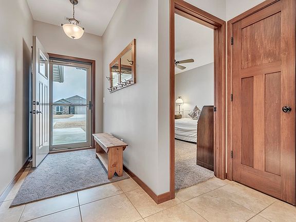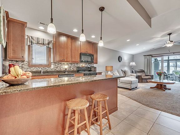 Villa with 4-Season Sunroom In Sought After Stoneybrook! This lovely one-level home has nice modern finishes like 3-panel doors, custom drapes, black appliances, stone countertops. Kitchen cabinet pullouts add functional storage. Living room opens to 4-season sunroom that welcomes abundant natural light. Primary suite has 3/4 bath and walk-in closet. Hosting company is a breeze with guest bedroom and pass-through bath. Laundry with sink leads to double attached garage. A/C replaced in 2024! NO Water During Flood. HOA maintains clubhouse/grounds and pool. Owners responsible for lawn care and snow removal. So many extras in this grand home; schedule a tour today!