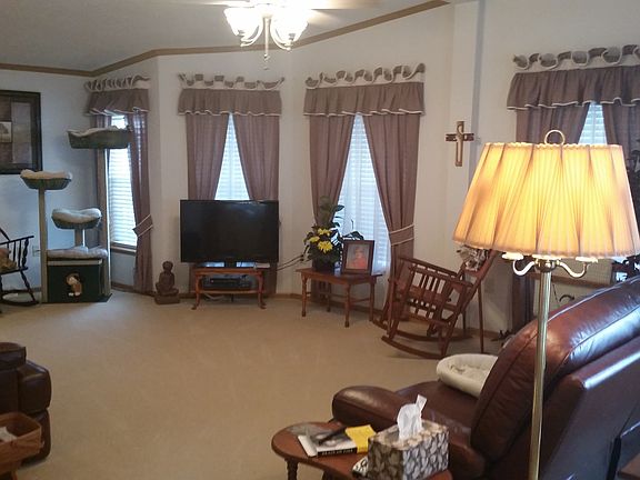 UNDER CONTRACT AS OF 8/8/14 GREAT LOCATION - FARM VIEW. This 2006 Pine Grove beautifully landscaped home is located in Eastwood Village and backs up to common area with peaceful surroundings. It is a 3BR, 2BTH drywall home. Features front 8x28 porch and 10 x 16 sunroom wtih ramp to the exterior. Enter into spacious living room that can accommodate larger furniture and has a corner stone gas remote fireplace. The kitchen and dining room flow off of Living room. Beautiful Hearthwall kitchen has raised panel cabinets, island with addtional drawers and cabinets for storage and a small bar sink beside the gas range. Appliances included are a 22 CuFt SBS refrigerator with ice and water, slide in gas range oven, microwave, dishwasher, washer and dryer. Master Suite has large walk in closet, platform soaker tub and separate corner shower. Immaculate, very well maintained home with service contracts on heating and cooling units. There are five TV and Phone jacks. An 8 x 10 shed wth platform around also included. Call today for your showing!